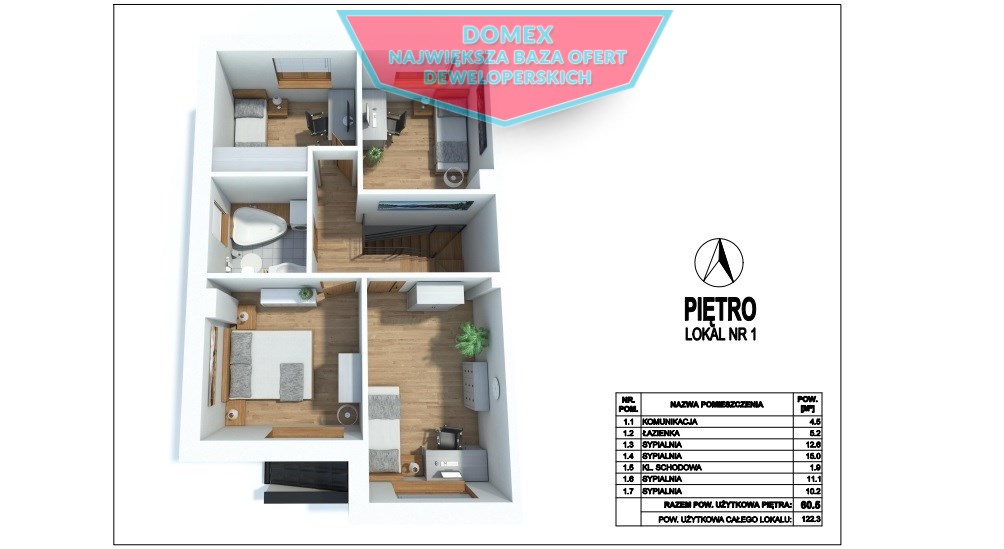 cztery pokoje (12,6 m2, 15,0 m2, 11,1 m2, 10,2 m2),